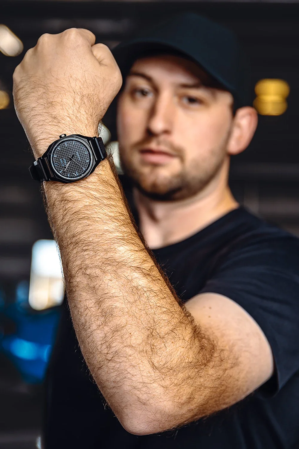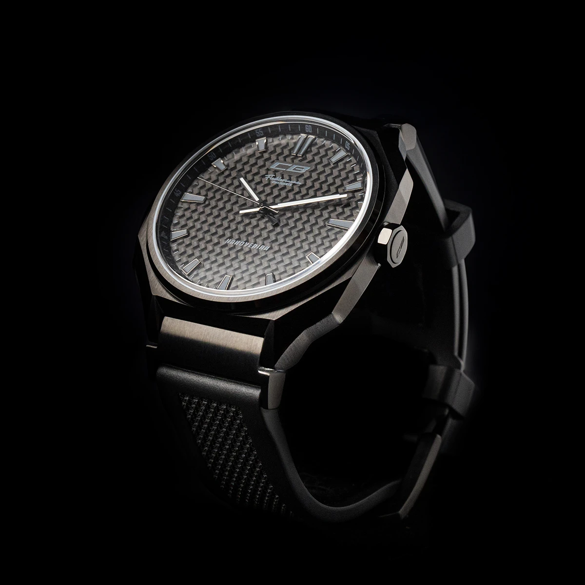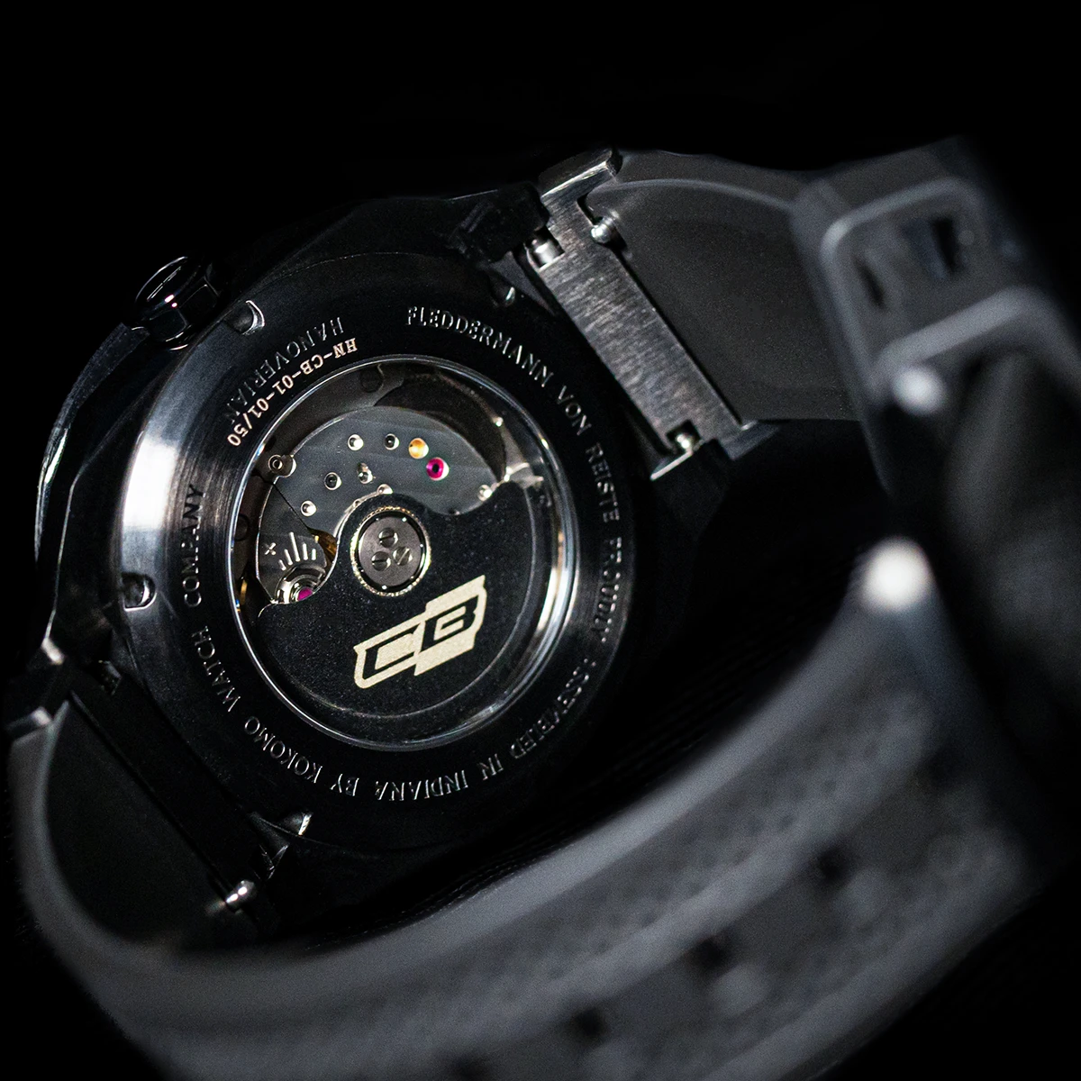 In addition to the standard features of the Fleddermann von Rieste Hanoverian, this limited-edition watch features a Blue Carbon Fiber Textured dial and exhibition case back showcasing the Cerakote plated, Chase Briscoe branded oscillating weight on the automatic watch movement.