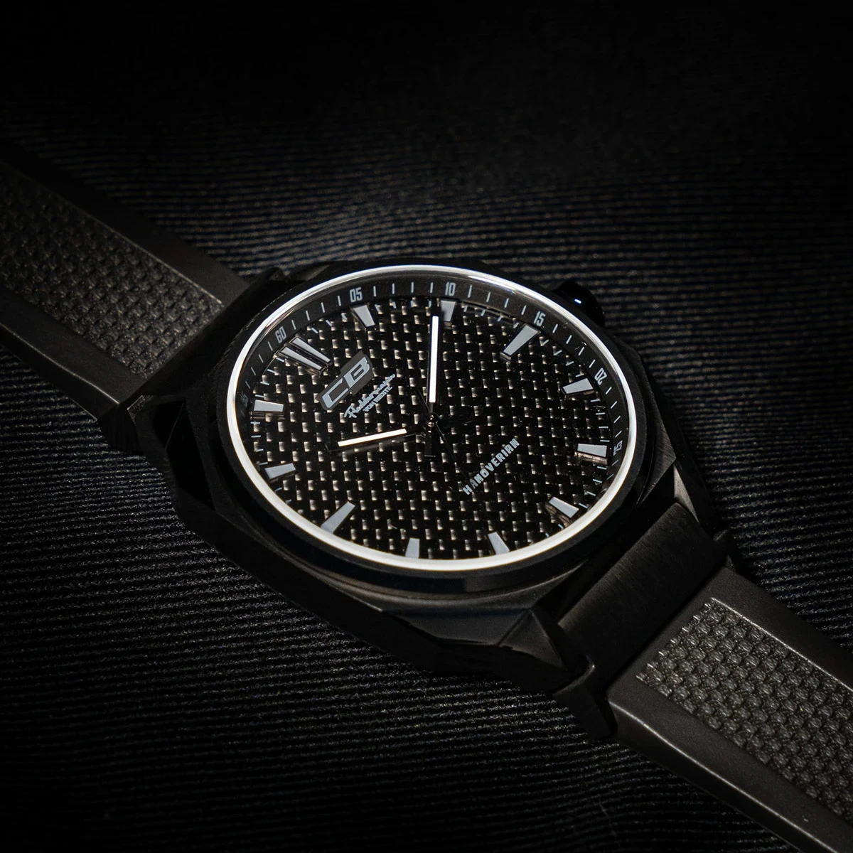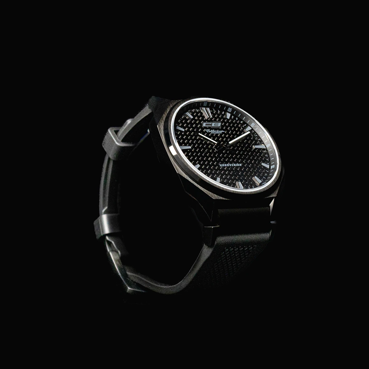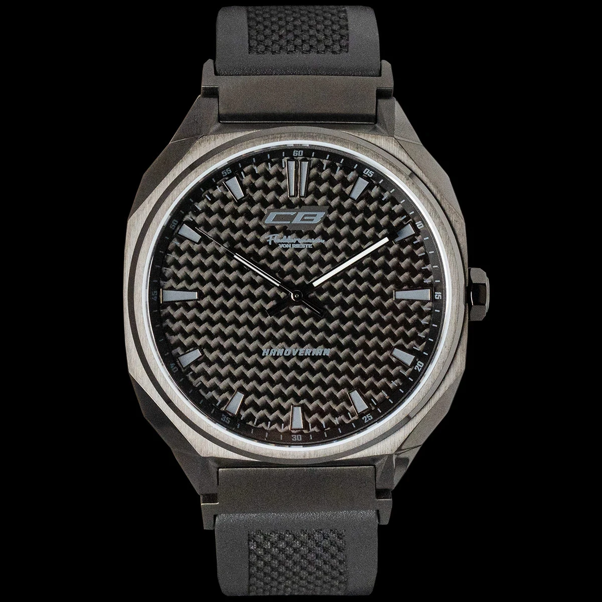 In addition to the standard features of the Fleddermann von Rieste Hanoverian, this limited-edition watch features a Blue Carbon Fiber Textured dial and exhibition case back showcasing the Cerakote plated, Chase Briscoe branded oscillating weight on the automatic watch movement.